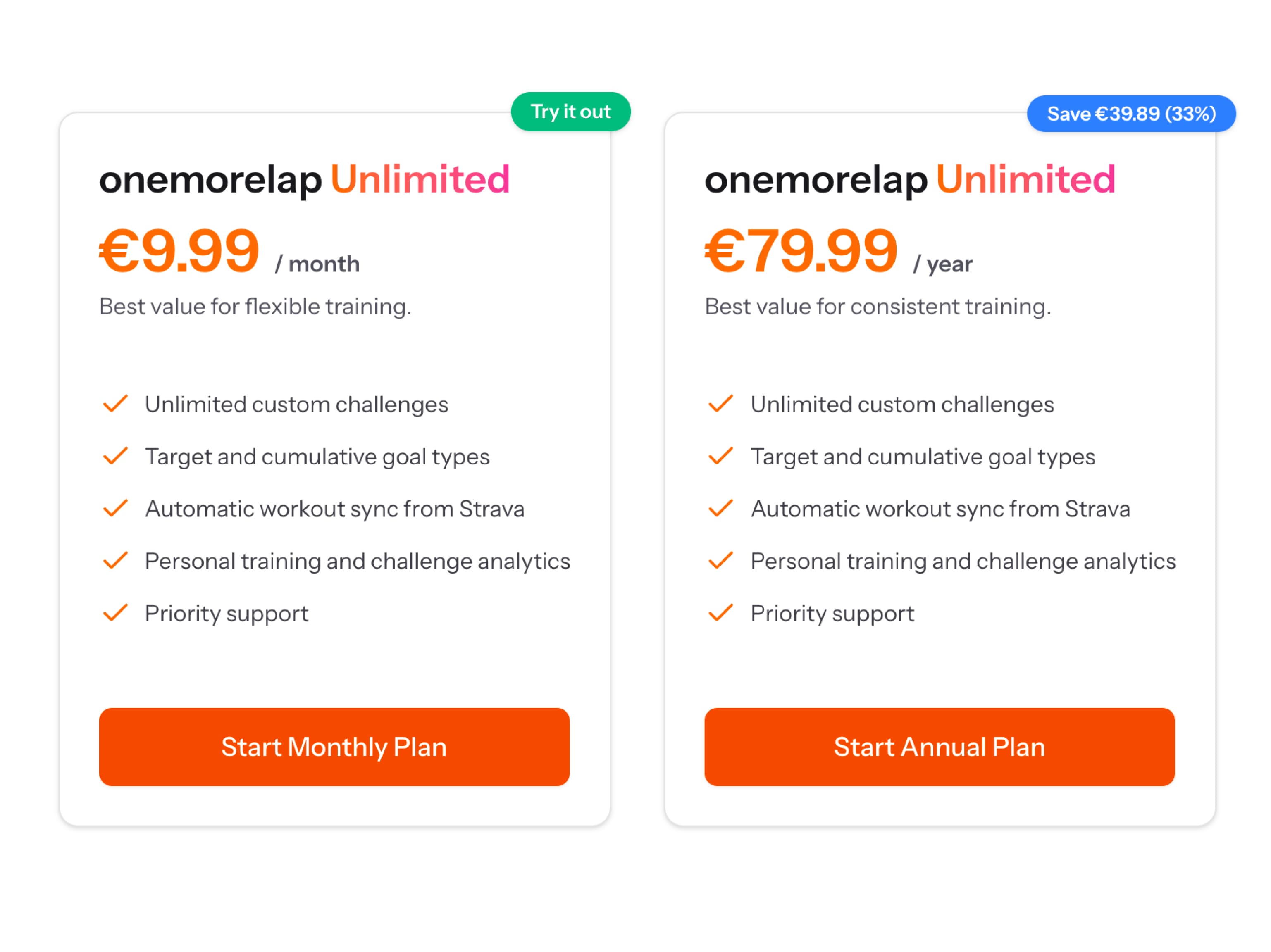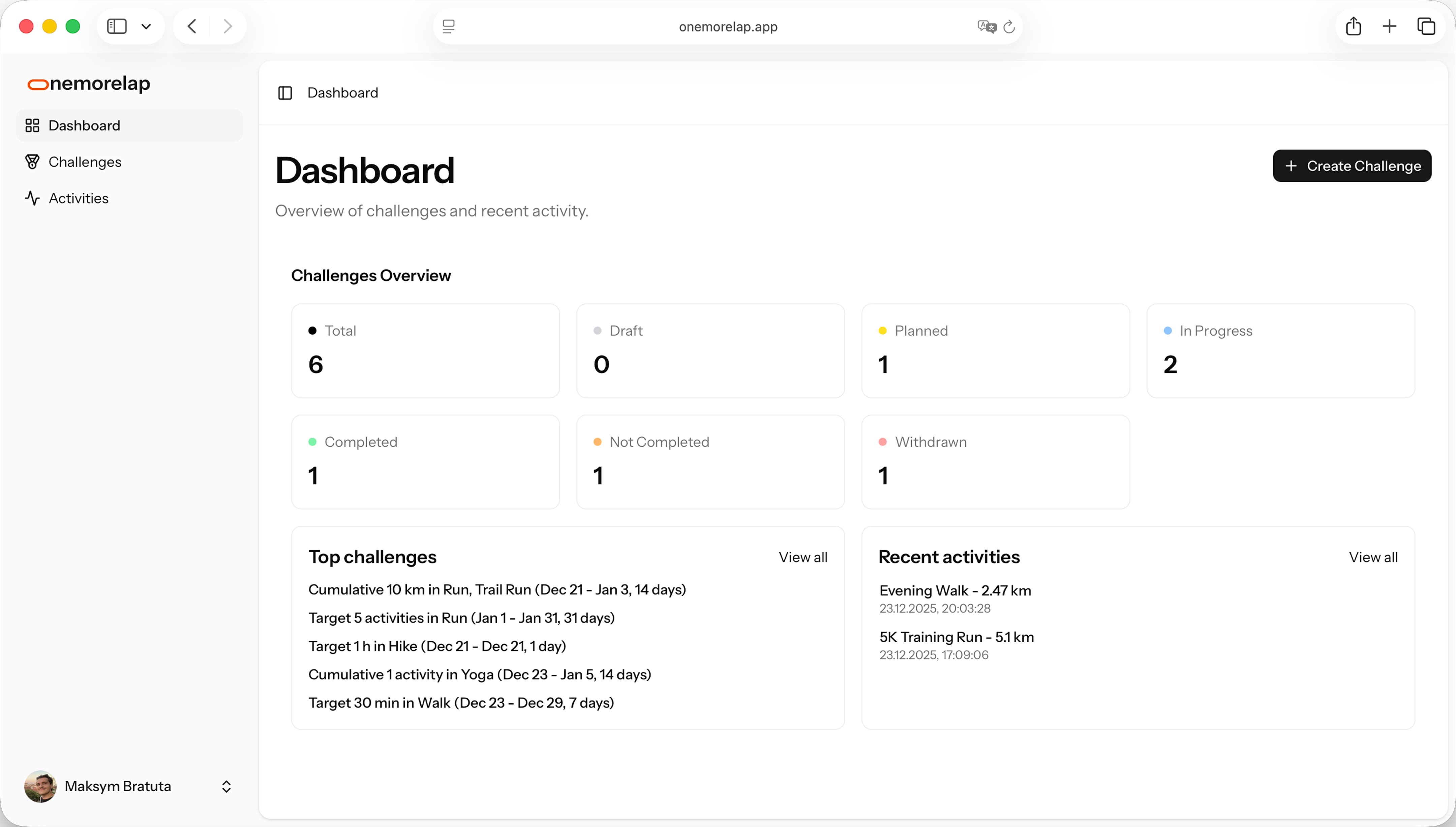 Join onemorelap today and start creating your own fitness challenges. Track real progress and achieve your goals with personalized challenges and Strava integration.