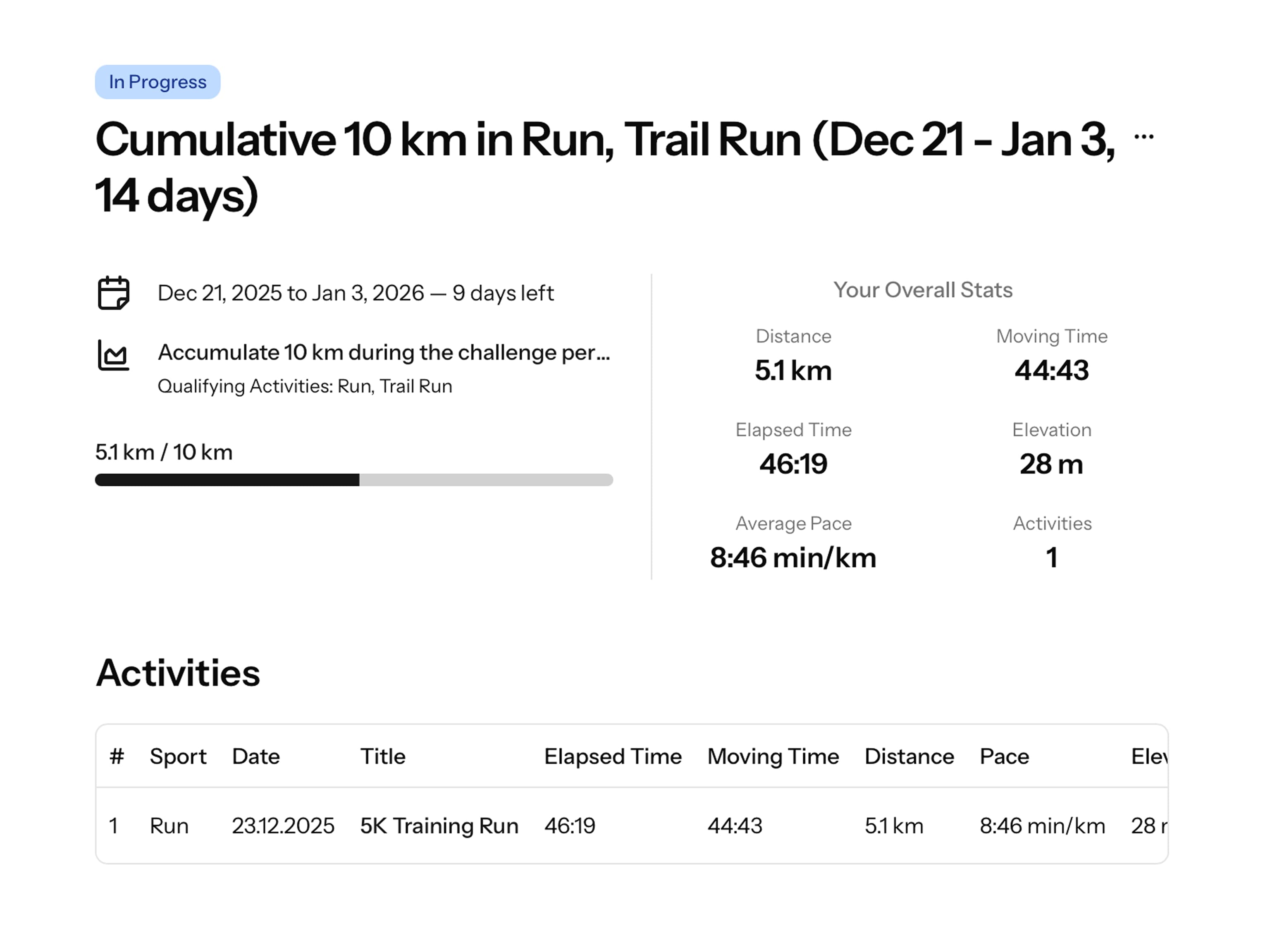 Connect your Strava account to sync your new workouts automatically. Complete your challenges with your actual training data, and track all your progress effortlessly.